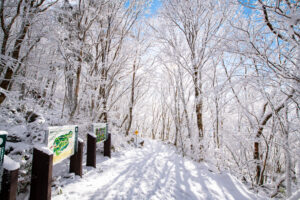 11月下旬頃から、道の駅布施ヶ坂付近から西へ向かうにつれて雪に包まれていきます。
